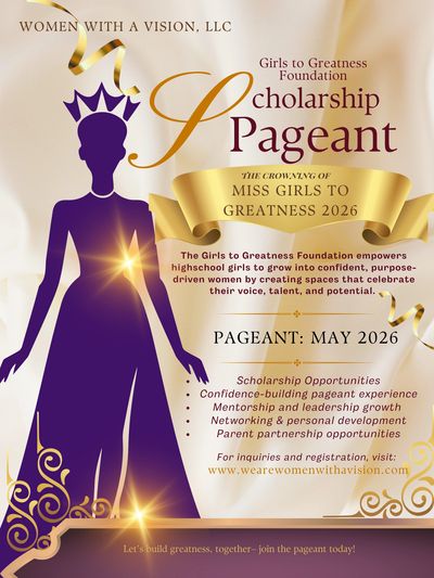 The Girls to Greatness Foundation is a new nonprofit initiative by Women with a Vision, LLC that empowers high school girls to grow into confident, purpose-driven women by creating spaces that celebrate their voice, talent, and potential. Through our upcoming signature scholarship pageants, mentorship experiences, and personal development opportunities, we help young women step into their greatness—equipped for life beyond high school and inspired to lead with authenticity.